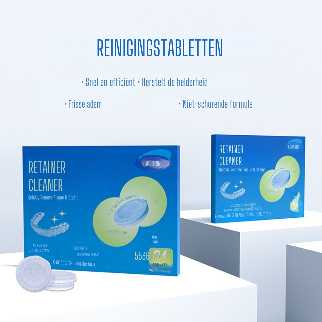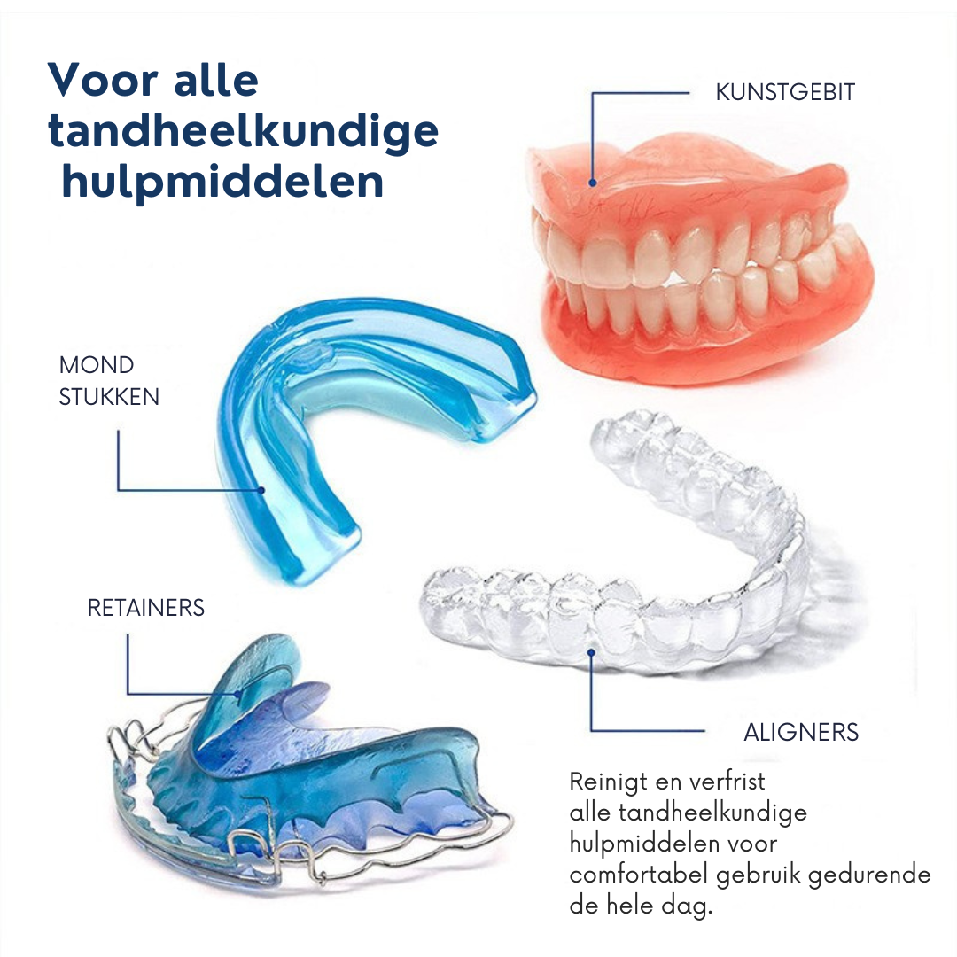 🦷 De tabletten lossen snel op en combineren met ultrasone golven om bacteriën, geurtjes en aanslag grondig te verwijderen.